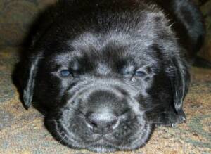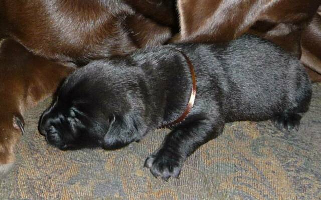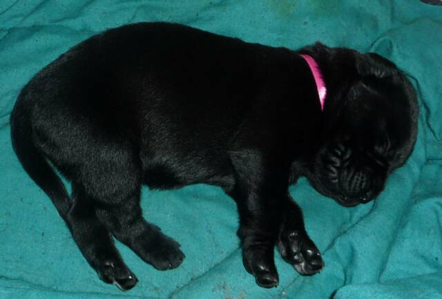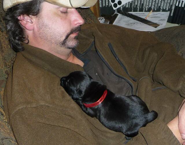 10/26/09 - The puppies all have their eyes open and can see well. They just learned how to drink milk from a pan and are starting play with each other. When they are done eating they like to crawl into my lap, snuggle up and fall asleep.